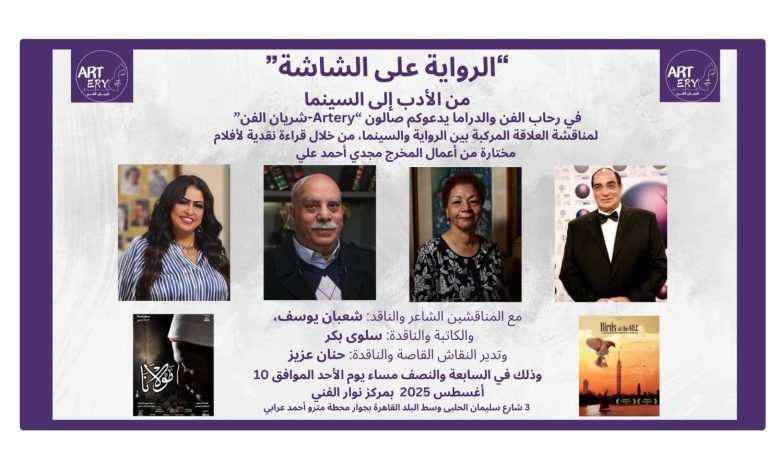 وتتضمن أمسية الفن والدراما في صالون شريان الفن، مناقشة العلاقة المركبة بين الرواية والسينما، من خلال قراءة نقدية لأفلام مختارة من أعمال المخرج مجدي أحمد علي، وعلى رأسها فيلم “عصافير النيل” المأخوذ عن رواية لإبراهيم أصلان، وفيلم “مولانا” المأخوذ عن رواية لإبراهيم عيسى.