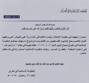 وفي بيان لها، قالت “المقاومة الإسلامية في العراق”: “استمرارا بنهجنا في مقاومة الاحتلال، ونصرة لأهلنا في غزة، وردا على المجازر التي يرتكبها الكيان الغاصب بحق المدنيين الفلسطينيين من أطفال ونساء وشيوخ، استهدف مجاهدو المقاومة الإسلامية في العراق صباح اليوم الأحد 7 / 4 / 2024 ، هدفا حيويا في إيلات (أم الرشراش) في أراضينا المحتلة، بالطيران المسير”.