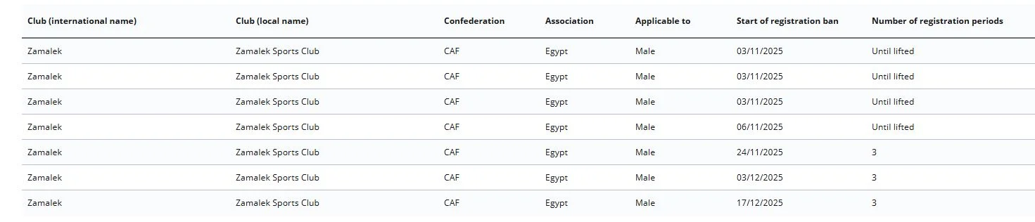 أعلن الاتحاد الدولي لكرة القدم “فيفا”، عبر موقعه الرسمي اليوم الأربعاء 17 ديسمبر 2025، عن إيقاف قيد نادي الزمالك في 3 فترات قيد، لحين تسوية النزاعات المالية المرتبطة بالقضايا الثلاث، دون الكشف عن هوية الأطراف المتسببة في القرارات.