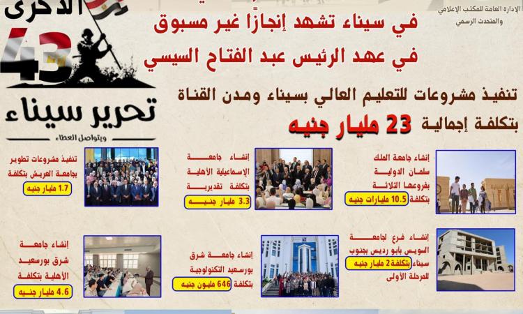 وصرح الدكتور عادل عبدالغفار المُستشار الإعلامي والمُتحدث الرسمي للوزارة، بأن إنشاء العديد من الجامعات في شبه جزيرة سيناء ومدن القناة، يأتي في إطار رؤية الدولة الشاملة حيث تم إنشاء جامعة العريش، وجامعة الملك سلمان الدولية، وجامعة الإسماعيلية الجديدة الأهلية، وجامعة شرق بورسعيد الأهلية، وجامعة شرق بورسعيد التكنولوجية، مشيرًا إلى أنه جار الانتهاء من إنشاء فرع جامعة السويس بأبورديس بجنوب سيناء والذي سيكون جامعة جنوب سيناء لتصبح أول جامعة حكومية، يتم إنشاؤها في جنوب سيناء.