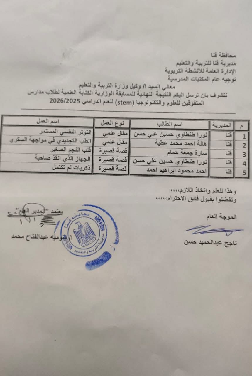 أعلن هاني عنتر الصابر، وكيل وزارة التربية والتعليم بقنا، نتيجة مسابقة الكتابة العلمية لطلاب مدارس المتفوقين في العلوم والتكنولوجيا (STEM)، والتي نظمها توجيه عام المكتبات المدرسية، تحت إشراف سومية عبد الفتاح، مدير عام الشؤون التنفيذية، وبإعداد وتنفيذ ناجح عبد الحميد حسن، موجه عام المكتبات بالمديرية، وأعضاء التوجيه.