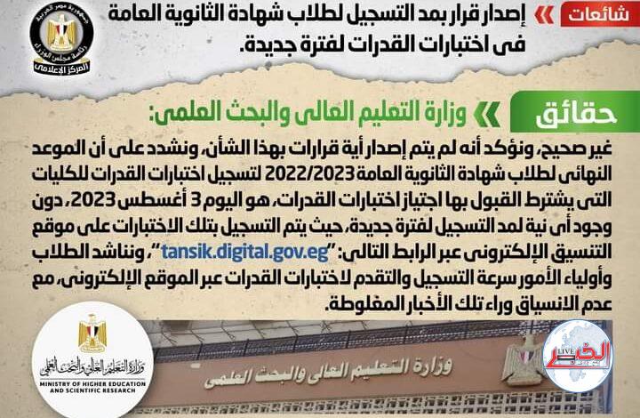نفت الحكومة ما تداولته بعض وسائل الإعلام والمواقع الإلكترونية وصفحات التواصل الإجتماعى من أنباء بشأن إصدار قرار بمد التسجيل لطلاب شهادة الثانوية العامة في اختبارات القدرات لفترة جديدة، المركز الإعلامي لمجلس الوزراء قال إنه بالتواصل مع وزارة التعليم العالي والبحث العلمى نفت تلك الأنباء.. مُؤكدةً أنه لا صحة لمد التسجيل لطلاب شهادة الثانوية العامة في اختبارات القدرات لفترة جديدة، وأنه لم يتم إصدار أية قرارات بهذا الشأن.
