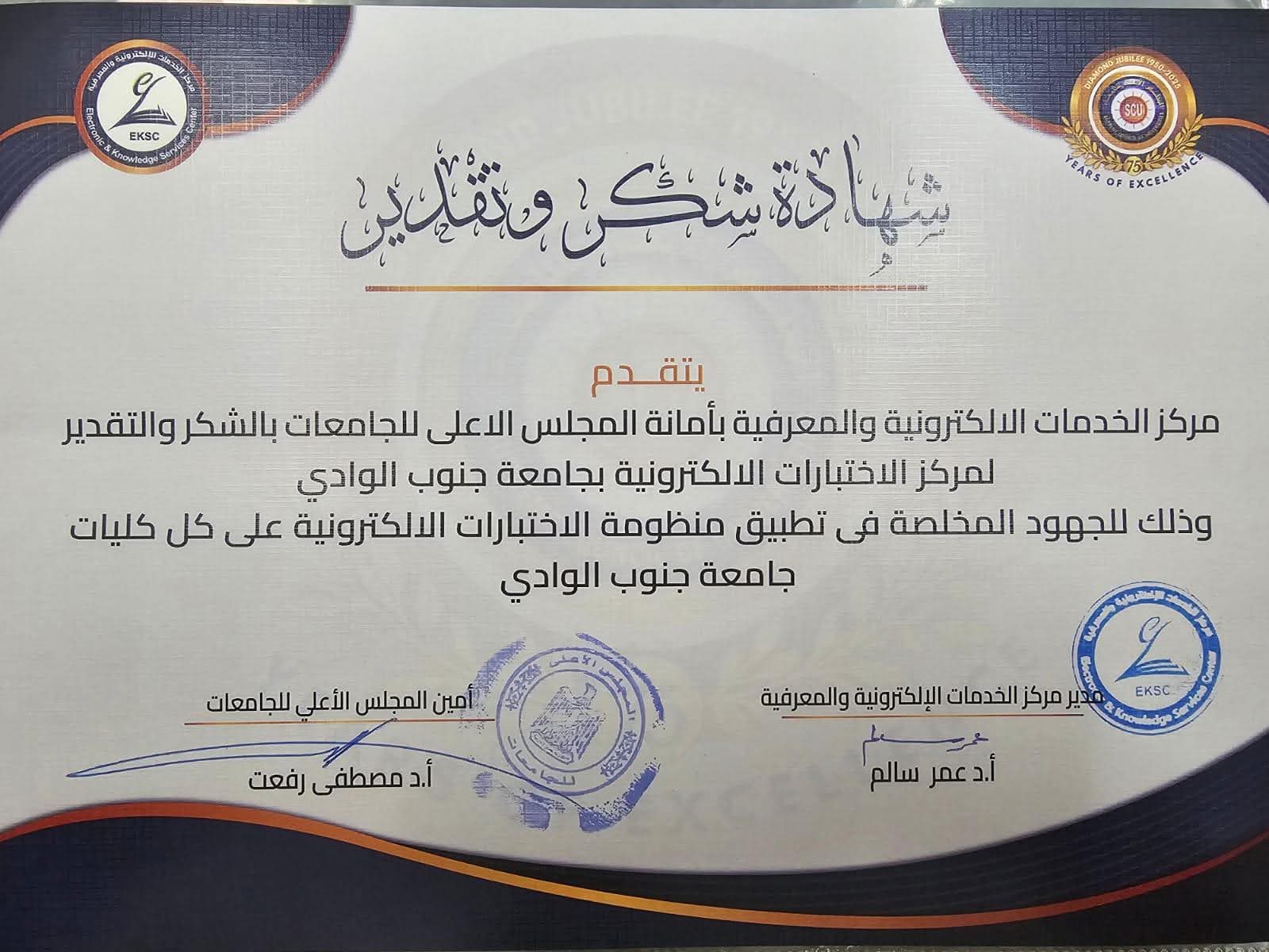 أعرب الدكتور أحمد عكاوي، رئيس جامعة قنا، عن خالص شكره وتقديره لأعضاء مركز الاختبارات الإلكترونية بالجامعة، وذلك عقب تلقي الجامعة خطاب شكر وتقدير من مركز الخدمات الإلكترونية والمعرفية بالأمانة العامة للمجلس الأعلى للجامعات، تقديرًا لما بذله المركز من جهود متميزة في تطبيق منظومة الاختبارات الإلكترونية على مستوى كليات الجامعة.