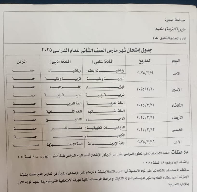 تعليم البحيرة يعتمد جداول امتحانات شهر مارس لصفوف النقل