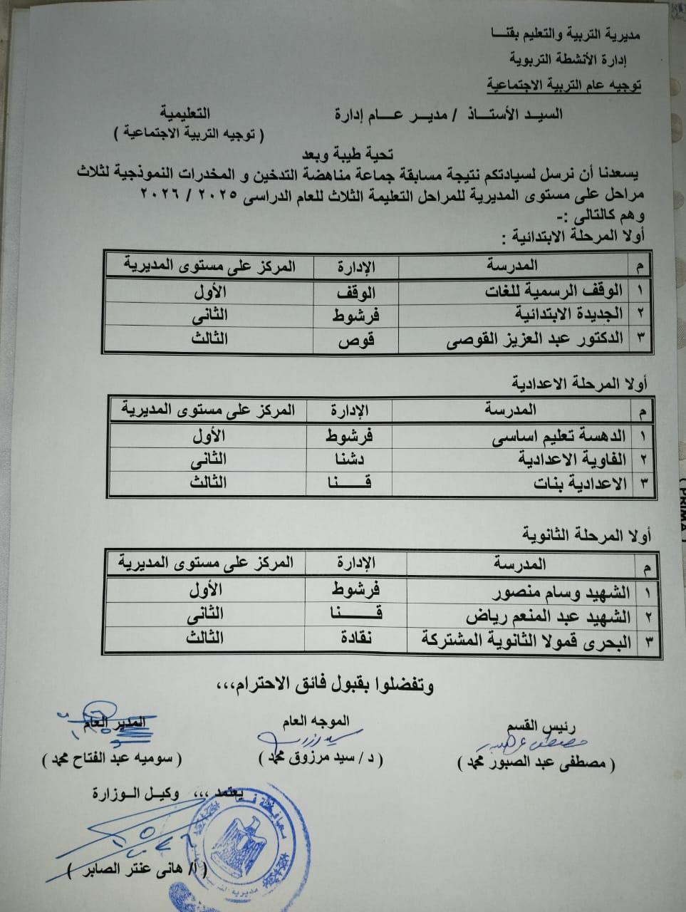 أعلن هانى عنتر الصابر، وكيل وزارة التربية والتعليم بمحافظة قنا، عن نتيجة مسابقة جماعة “مناهضة التدخين والمخدرات النموذجية” للعام الدراسي 2025-2026، التي أُقيمت للمراحل التعليمية الثلاث: الإبتدائية والإعدادية والثانوية على مستوى المحافظة.