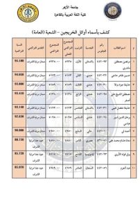 ونشرت كلية اللغة العربية بالقاهرة، عبر صفحتها عبر موقع التواصل الاجتماعي فيس بوك، قوائم لأوائل خريجيها، حيث قالت: تتقدَّم كلية اللغة العربية بالقاهرة ممثلة في عميدها الدكتور علاء جانب، ووكيليها الأستاذ الدكتور محمد سعدي، والدكتور أحمد عيد، وأعضاء هيئة التدريس، وجميع منسوبيها؛ بخالص التهنئة لأوائل خريجيها بالشعبة العامة، وشعبة التاريخ، وشعبة الحضارة للعام الجامعي 2024/ 2025م، راجين لهم دوام التوفيق والسداد والرُّقي في حياتهم العملية والعلمية.