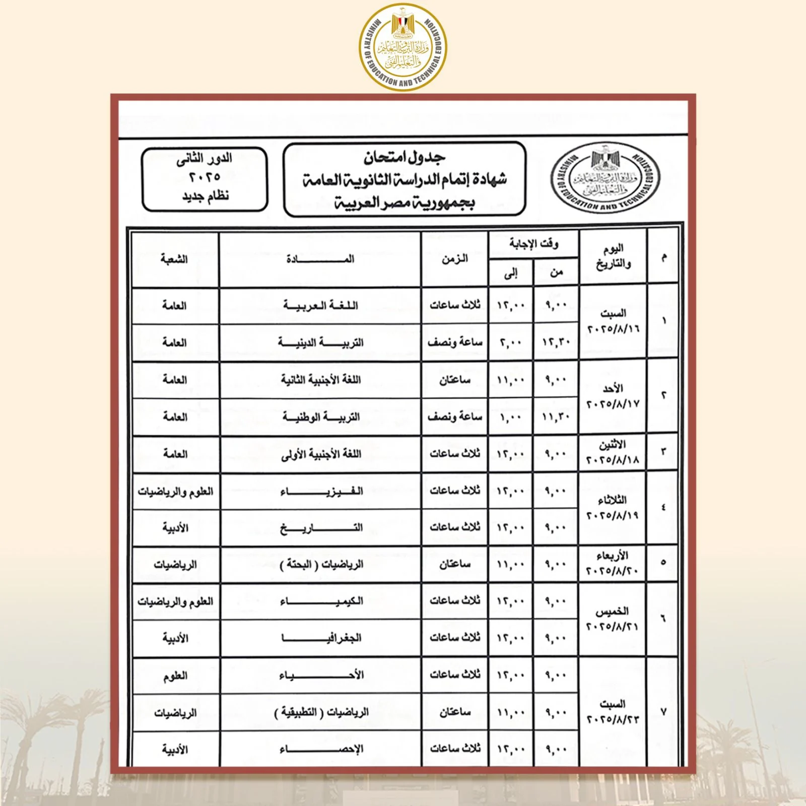جدول امتحانات الثانوية العامة 2025 “الدور الثاني”
