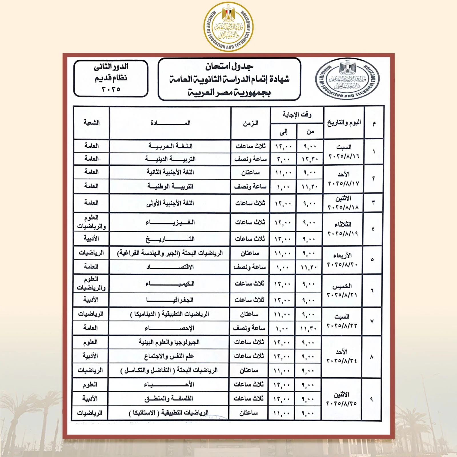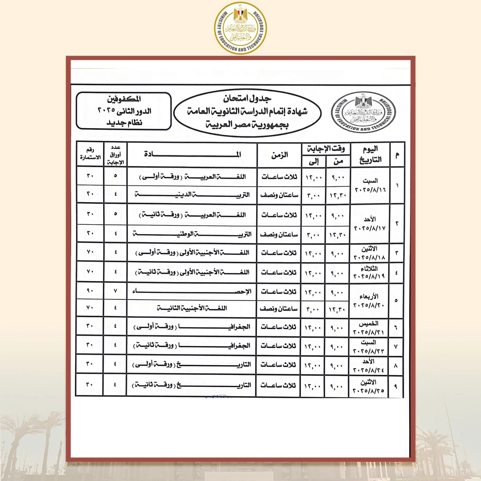 جدول امتحانات الدور الثاني للثانوية العامة 2025