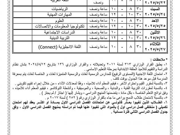 جدول امتحانات الصف السادس الابتدائي 2025 بالفيوم