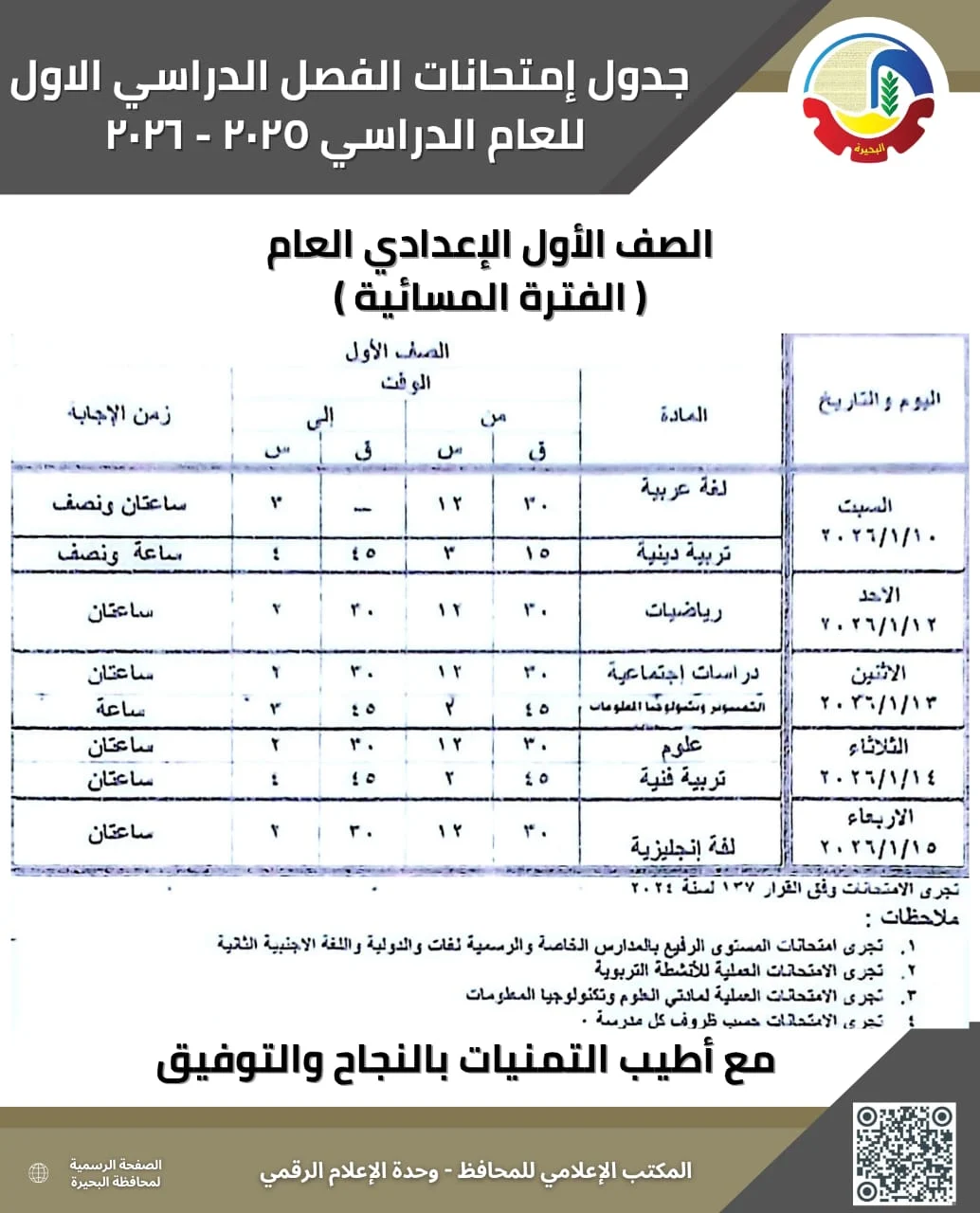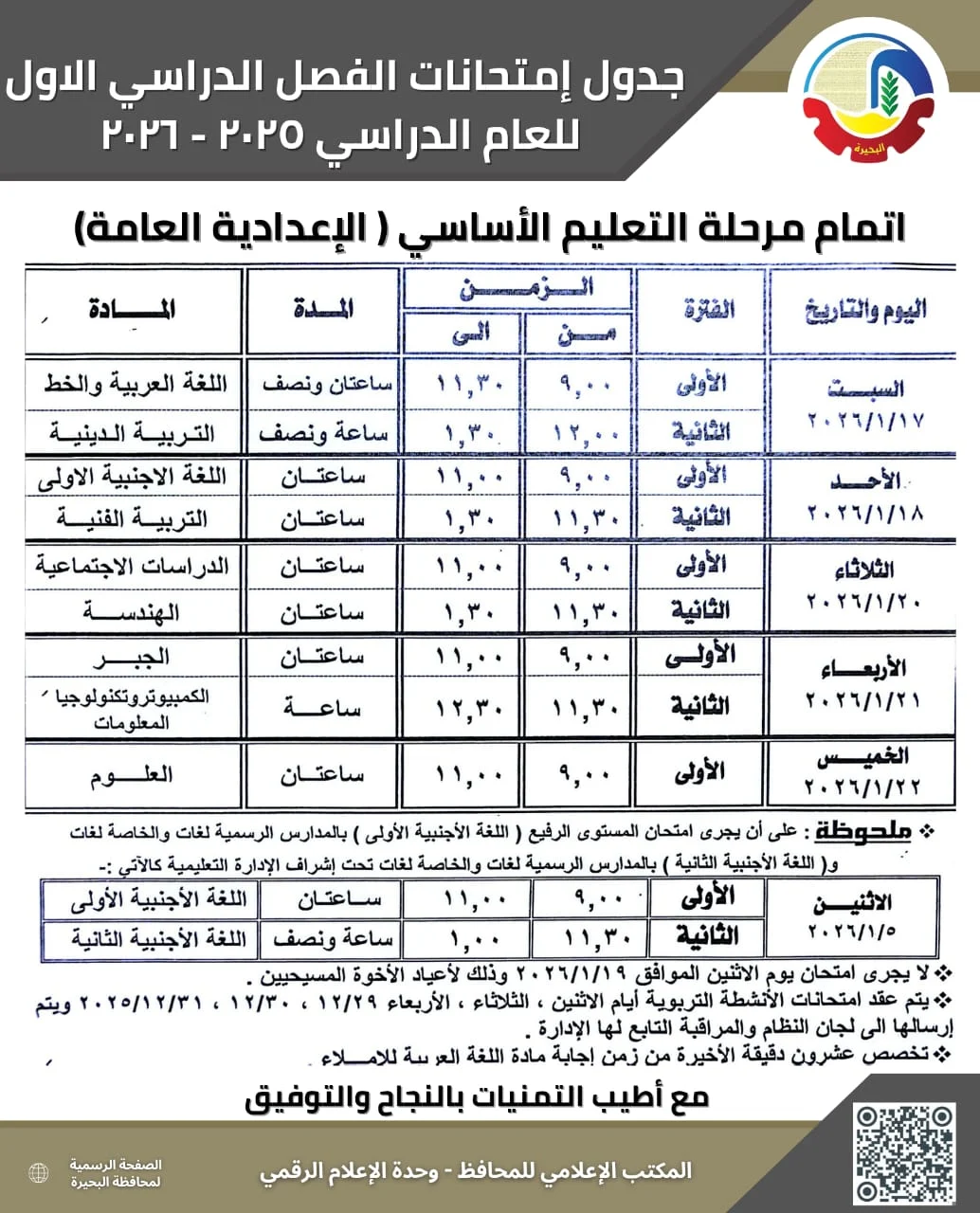 جدول امتحانات الفصل الدراسي الأول لطلاب الشهادة الإعدادية بالبحيرة