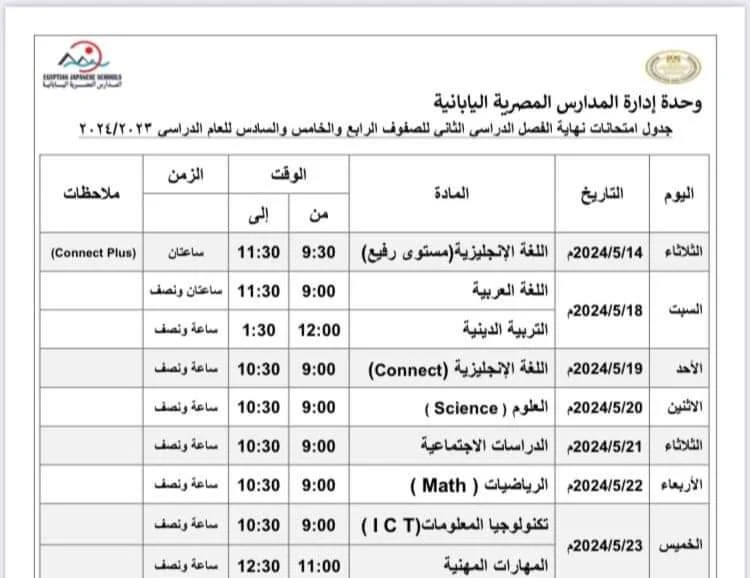 أعلنت وحدة المدارس المصرية اليابانية بوزارة التربية والتعليم والتعليم الفني جدول امتحانات الفصل الدراسي الثاني للعام الدراسي الحالي 2023/2024 للمرحلة الابتدائية، من المقرر أن تبدأ الامتحانات في 14 مايو المقبل.
