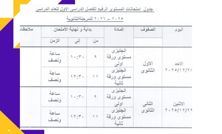 من المهم التنويه بأن جدول امتحانات نصف العام 2026 لجميع المراحل (صفوف النقل والشهادة الإعدادية) ليس موحدًا على مستوى الجمهورية.
