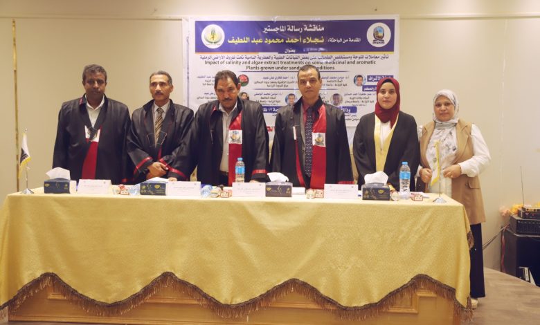 نوقشت بكلية الزراعة بجامعة قنا رسالة الماجستير المقدمة من الباحثة نجلاء أحمد محمود عبد اللطيف، بعنوان: «تأثير معاملات الملوحة ومستخلص الطحالب على بعض النباتات الطبية والعطرية النامية تحت ظروف الأراضي الرملية».