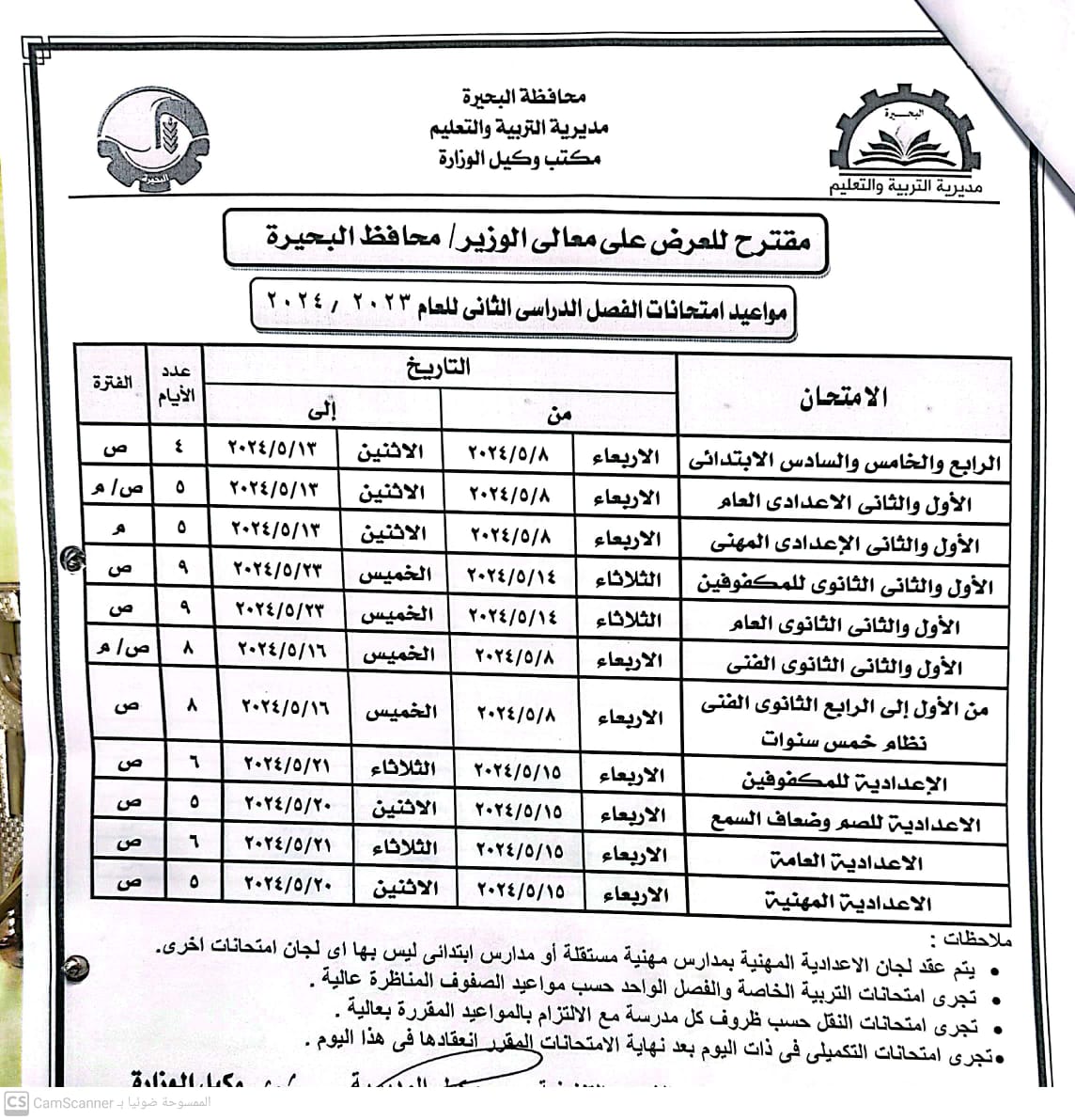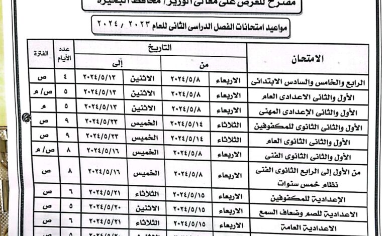 مواعيد امتحانات الفصل الدراسي الثاني لجميع المراحل التعليمية في البحيرة