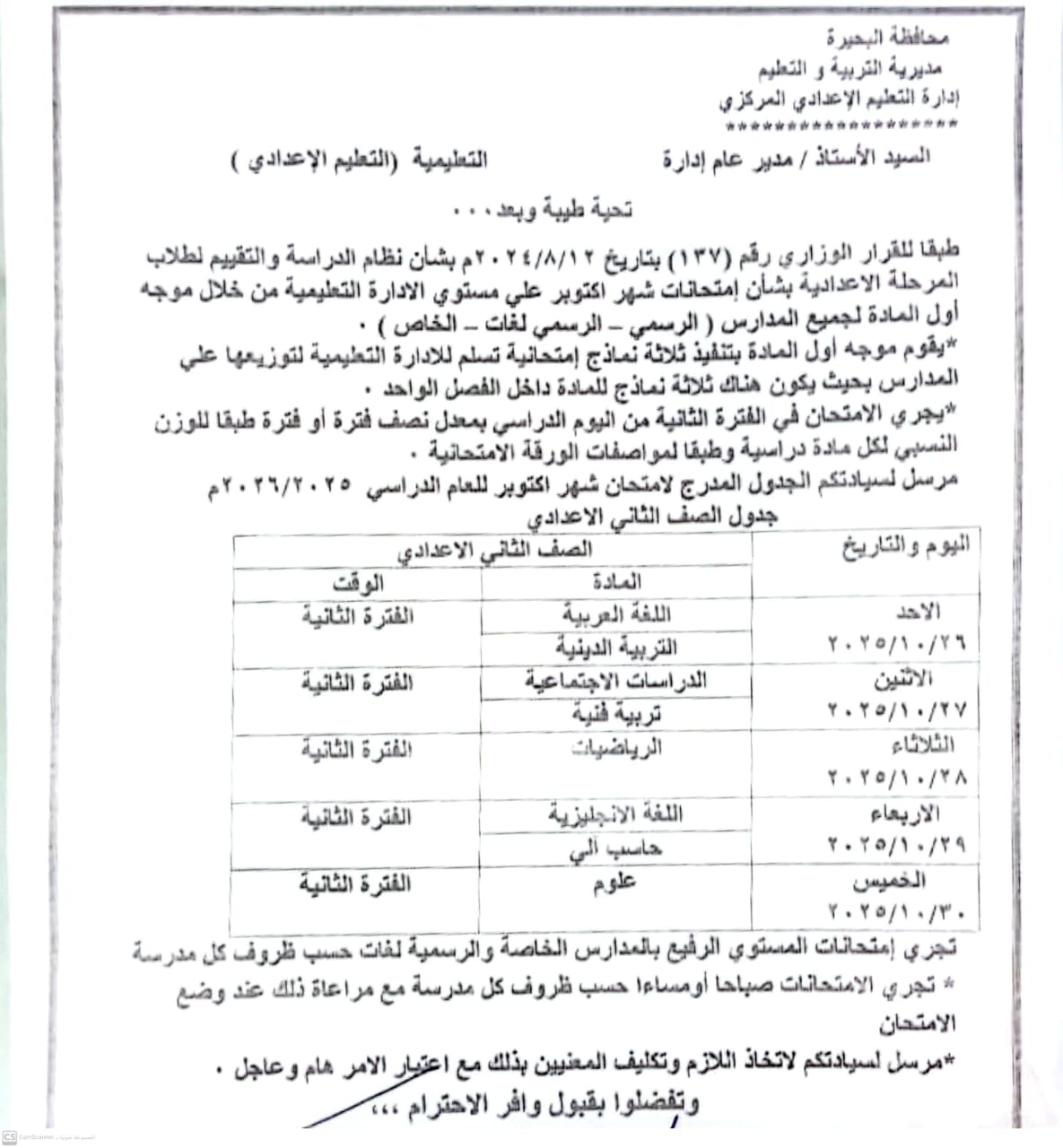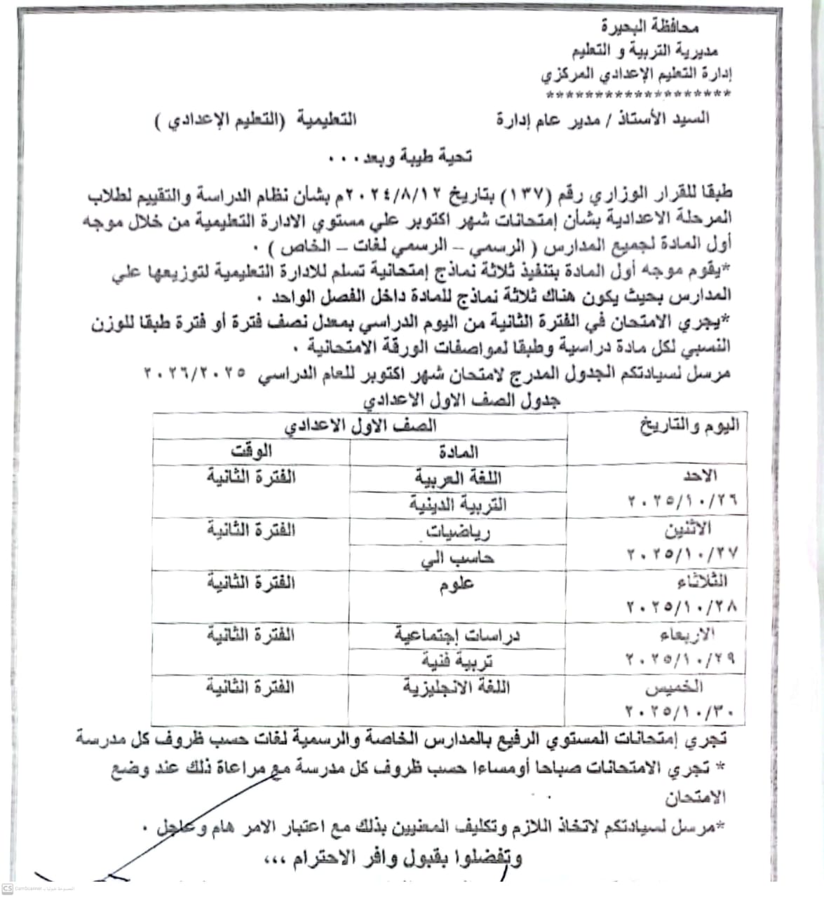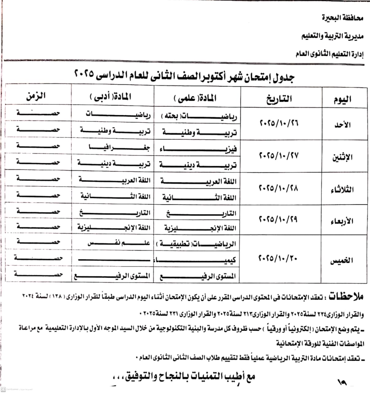 جداول امتحانات شهر أكتوبر، أعلنت مديرية التربية والتعليم بمحافظة البحيرة، عن جداول امتحانات شهر أكتوبر لصفوف النقل بمراحل التعليم الثلاثة “الابتدائية والإعدادية والثانوية”، للعام الدراسي 2025-2026.