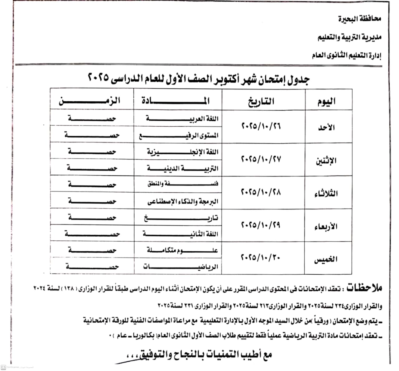 وأكد يوسف الديب وكيل وزارة التربية والتعليم بالبحيرة أن جميع الامتحانات ستقام أثناء اليوم الدراسي لضمان انتظام العملية التعليمية وعدم تعطيل الحصص أو الإخلال باليوم الدراسي وخطط المناهج الدراسية