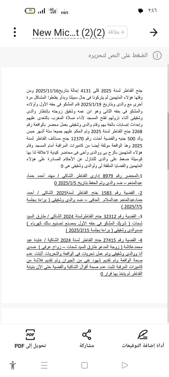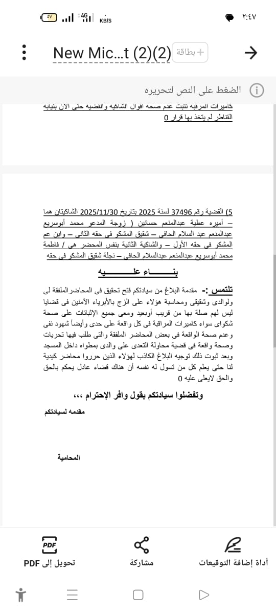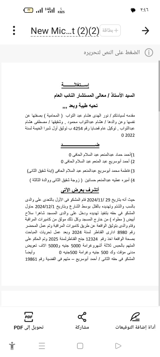 - تعرّض والد المحامية لاعتداء بتاريخ 1 ديسمبر 2024 باستخدام سلاح أبيض (مطواة)، وتم إثبات الواقعة في المحضر رقم 8980 لسنة 2024 إداري القناطر.