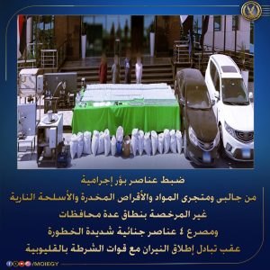 عقب تقنين الإجراءات تم إستهدافهم بالتنسيق مع قطاع الأمن المركزى، وقد أسفر التعامل عن مصرع (4 عناصر جنائية شديدة الخطورة، محكوم عليهم بالسجن والسجن المؤبد فى جنايات “قتل ، إتجار بالمخدرات ، سلاح نارى ، سرقة بالإكراه ، مقاومة سلطات) بنطاق محافظة القليوبية، وضبط باقى عناصر تلك البؤر، وبحوزتهم (أكثر من 359 كيلو جرام من المواد المخدرة المتنوعة “حشيش ، هيدرو ، كوكايين ، هيروين ، فودو ، شابو ، بودرة ترامادول” – 250 ألف قرص مخدر – 62 قطعة سلاح نارى متنوعة وكمية من الذخائر).