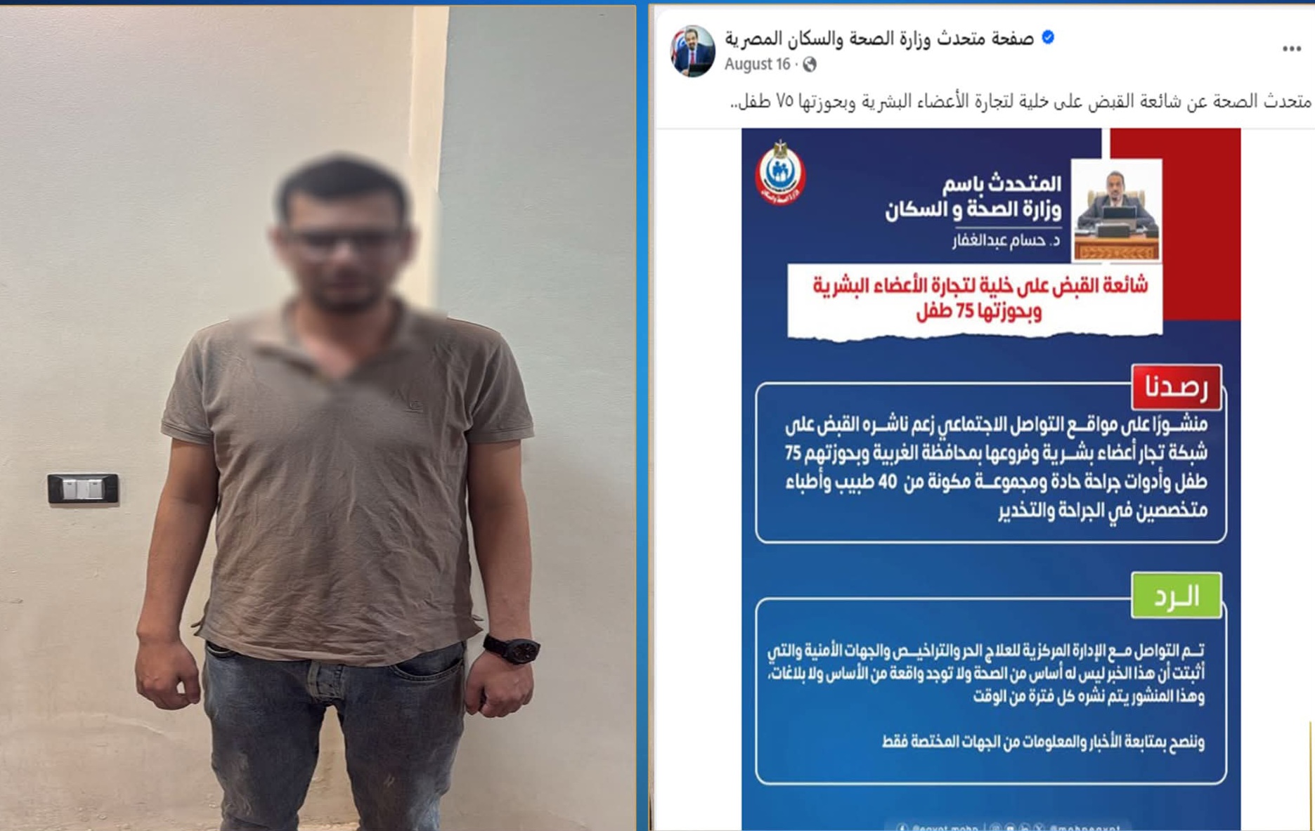 في إطار جهود وزارة الداخلية لملاحقة مروّجي الشائعات ومكافحة الأخبار المضللة على مواقع التواصل الاجتماعي، كشفت الأجهزة الأمنية حقيقة ما تم تداوله على إحدى الصفحات بشأن ضبط تشكيل عصابي يضم عددًا من الأطباء بتخصصي الجراحة والتخدير، بزعم تورطهم في الإتجار بالأعضاء البشرية وبحوزتهم 75 طفلًا بمحافظة الغربية.