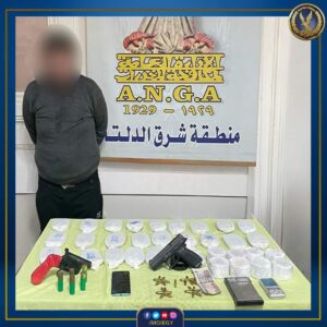 كما تم عاطل له معلومات جنائية بدائرة مركز شرطة أجا بالدقهلية.. وبحوزته 5 كيلو جرام لمخدر الحشيش و2 كيلو جرام لمخدر الهيروين وطبنجة وفرد خرطوش وعدد من الطلقات مختلفة الأعيرة و2 سلاح أبيض و2 ميزان حساس.