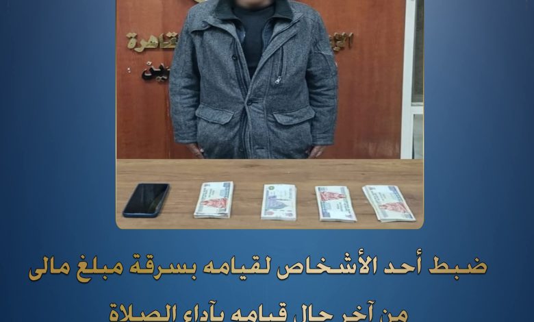 فى إطار كشف ملابسات ما تبلغ لقسم شرطة عابدين بمديرية أمن القاهرة من (أحد الأشخاص – مقيم بدائرة قسم الحدائق) بإكتشافه سرقة مبلغ مالى من ملابسه حال قيامه بأداء الصلاة بأحد المساجد بدائرة القسم.
