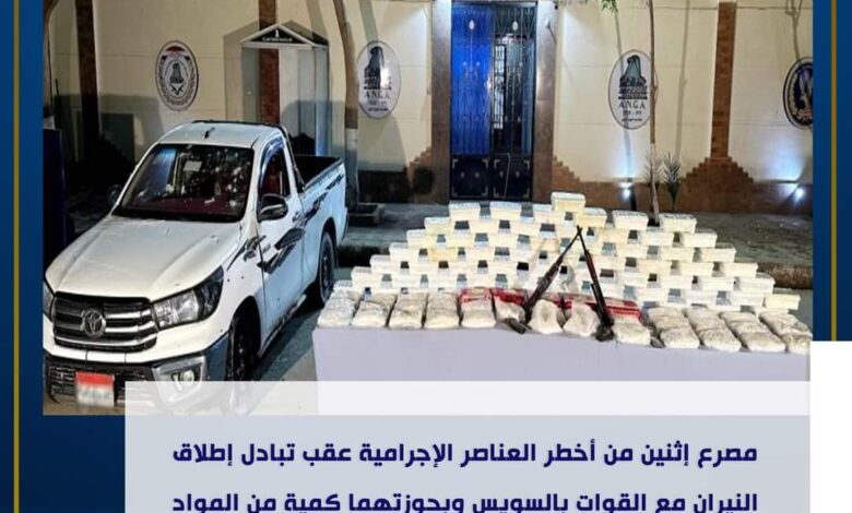 وبإستهدافهما بالتنسيق مع قطاعى الأمن العام والأمن المركزى بدائرة قسم شرطة عتاقة بالسويس ولدى إستشعارهما بالقوات بادرا بإطلاق الأعيرة النارية تجاه القوات وتم السيطرة على الموقف .. وأسفر التعامل عن مصرعهما وعُثر بحوزتهما على 100 كيلو جرام لمخدر الشابو و2 بندقية آلية و2 خزينة وعدد من الطلقات لذات العيار.