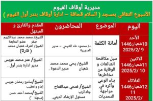 تأتي هذه الفعاليات بتوجيهات من معالي وزير الأوقاف أ.د/ أسامة السيد الأزهري، وبرعاية فضيلة الدكتور/ محمود الشيمي، مدير مديرية أوقاف الفيوم. ويهدف الأسبوع الثقافي إلى تقديم خطاب ديني وسطي ورشيد يسهم في رفع الوعي الديني والثقافي لدى رواد المسجد وأهالي المنطقة.