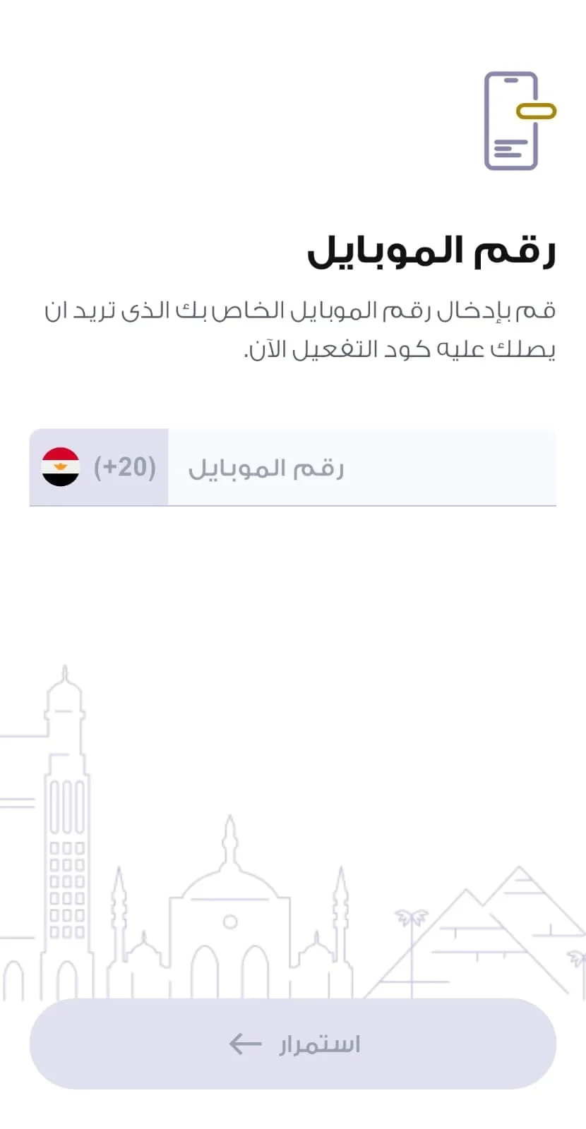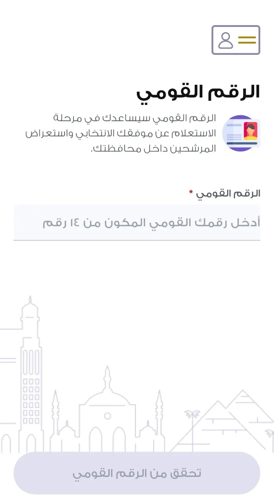بعد الانتهاء من تحميل التطبيق، يقوم المستخدم بإدخال رقم الهاتف المحمول ثم الرقم القومي المكون من 14 رقمًا، لتظهر صفحة تتضمن خيارين: