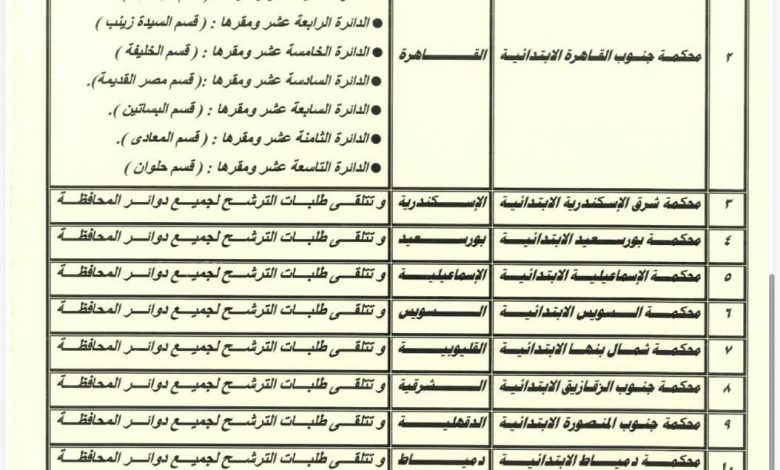 حددت الهيئة الوطنية للانتخابات المحاكم المختصة بتلقى طلبات الترشح لانتخابات مجلس النواب 2025 في الكشوف التالية