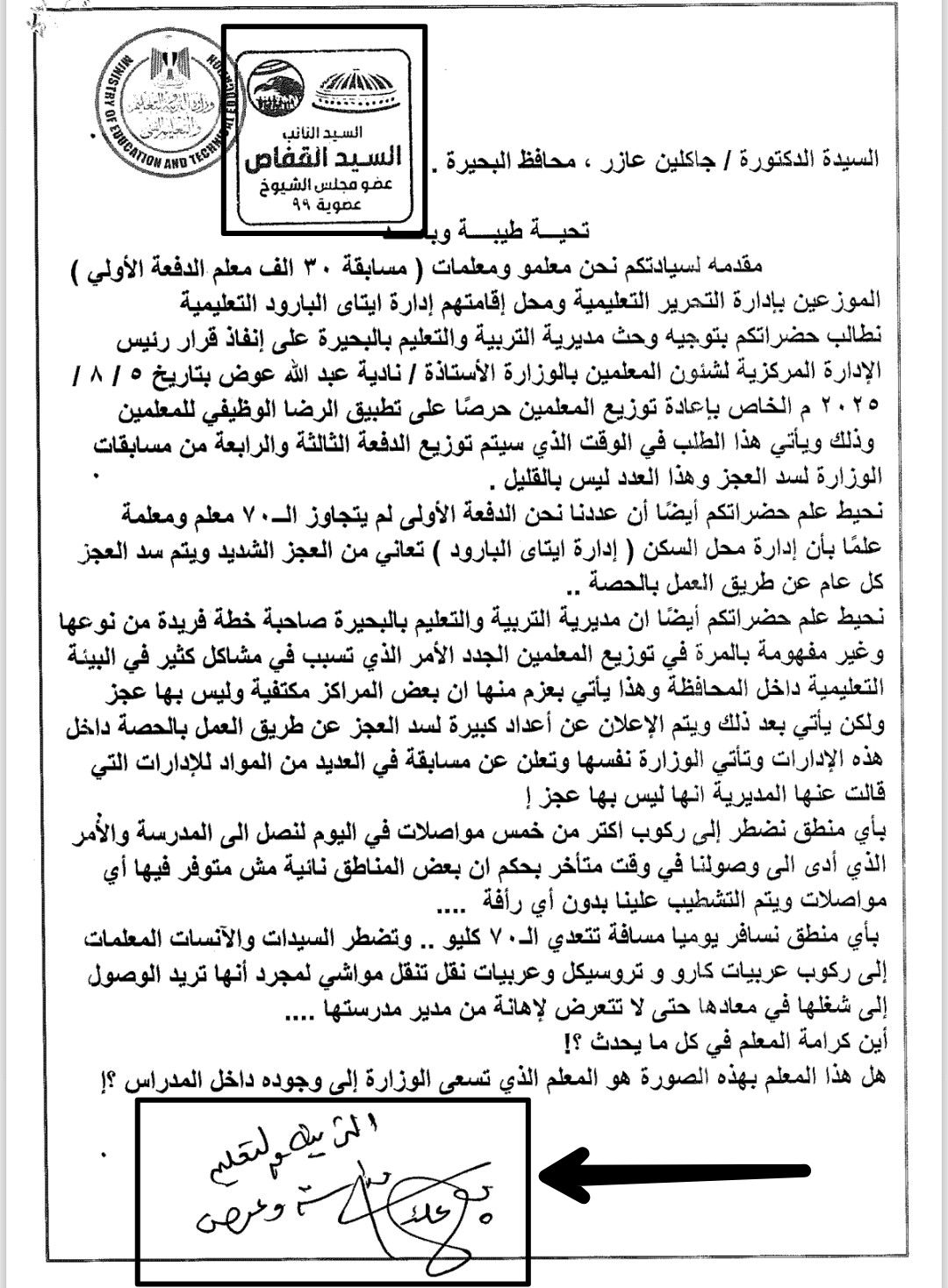 تقدم النائب سيد القفاص، عضو مجلس الشيوخ، وأمين مساعد حزب مستقبل وطن بالبحيرة، بطلب للدكتورة جاكلين عازر، محافظ البحيرة، بشأن شكاوى عدد من المعلمين من أبناء إدارة إيتاي البارود التعليمية، لتضررهم من التوزيع الجغرافي، على إدارة التحرير التعليمية رغم وجود عجز فعلي بالإدارة محل سكنهم.