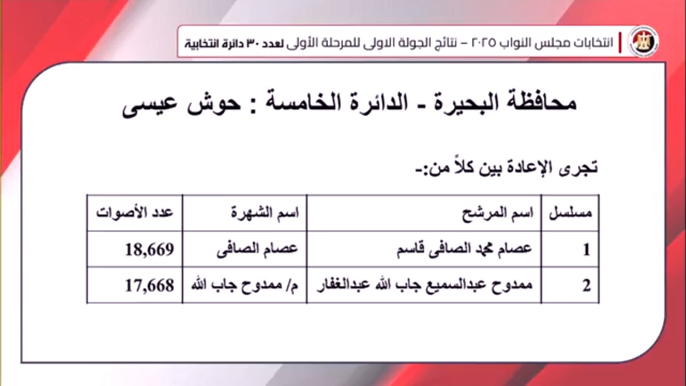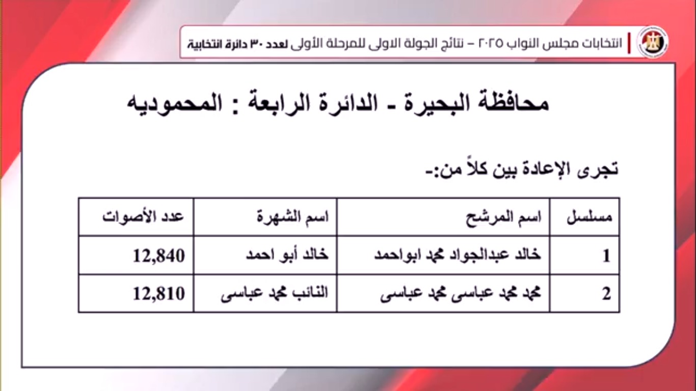 ومن المقرر أن تُجرى جولة الإعادة لهذه الدوائر – في حال وجودها – يومي 31 ديسمبر الجاري والأول من يناير المقبل خارج البلاد، ويومي 3 و4 يناير المقبل بالداخل، على أن تُعلن النتيجة النهائية يوم 10 يناير 2026، وهو آخر موعد لانتهاء الانتخابات.