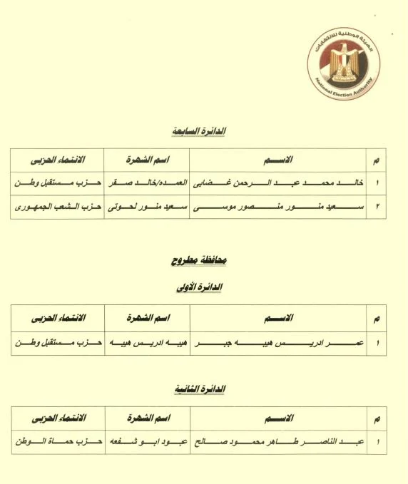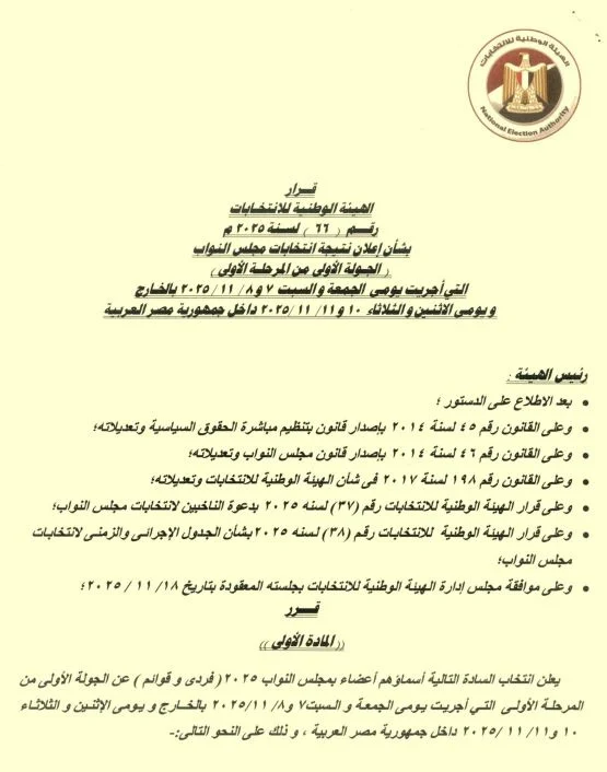 وأوضح القرار أن عدد النواب الذين فازوا في هذه المرحلة بلغ 42 مرشحًا، وذلك بعد إجراء الانتخابات في الخارج يومي 7 و8 نوفمبر وفي الداخل يومي 10 و11 نوفمبر.