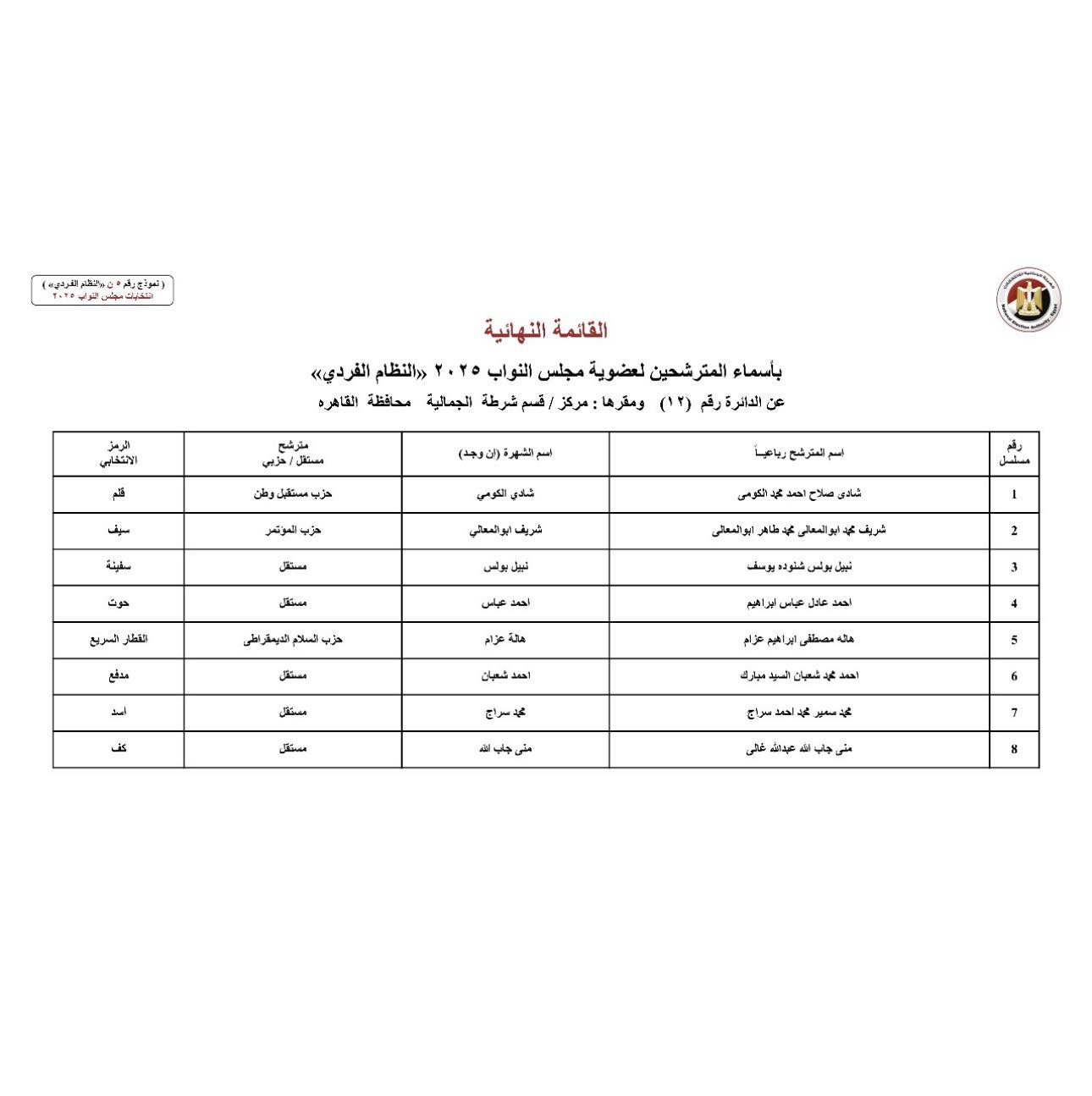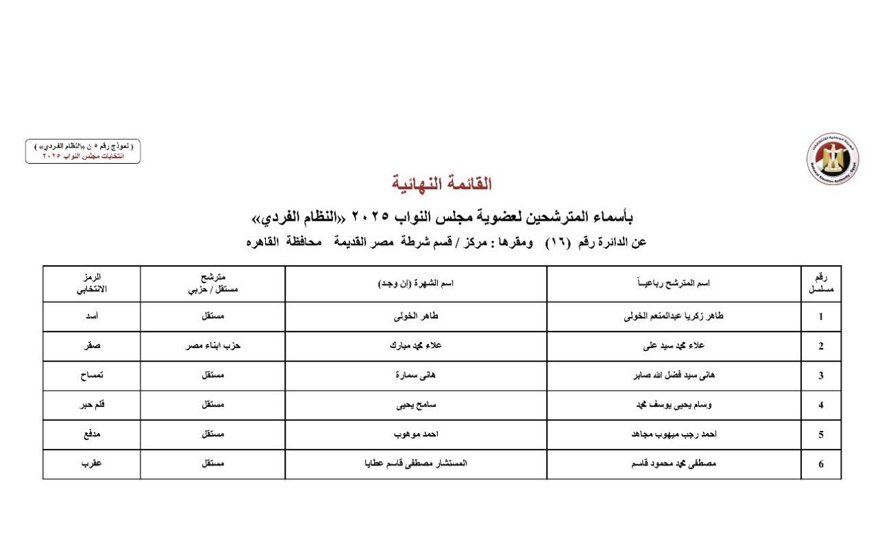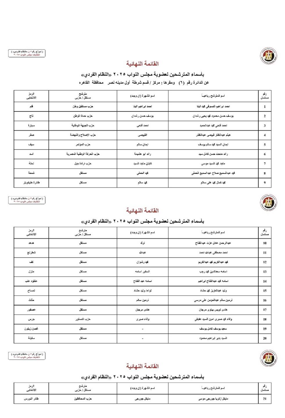 أسماء المترشحين النهائية بمحافظة القاهرة، أعلنت الهيئة الوطنية للانتخابات، القائمة النهائية لأسماء المرشحين علي النظام الفردي ورموزهم عن الدوائر الانتخابية بمحافظة في القاهرة لانتخابات مجلس النواب 2025.