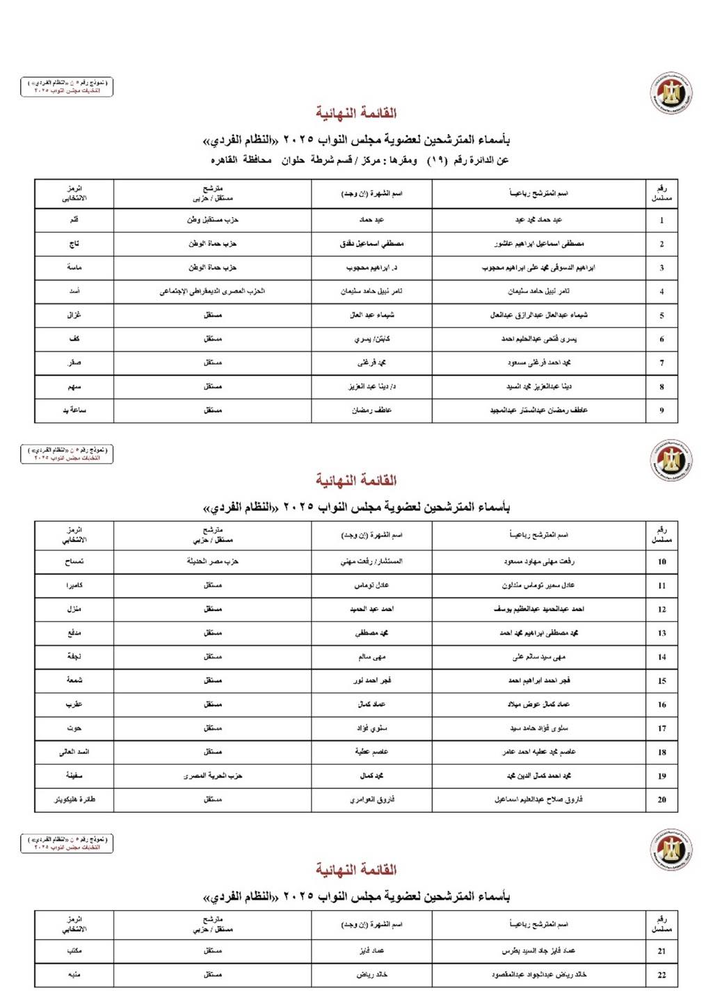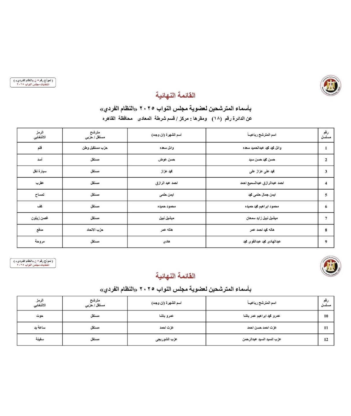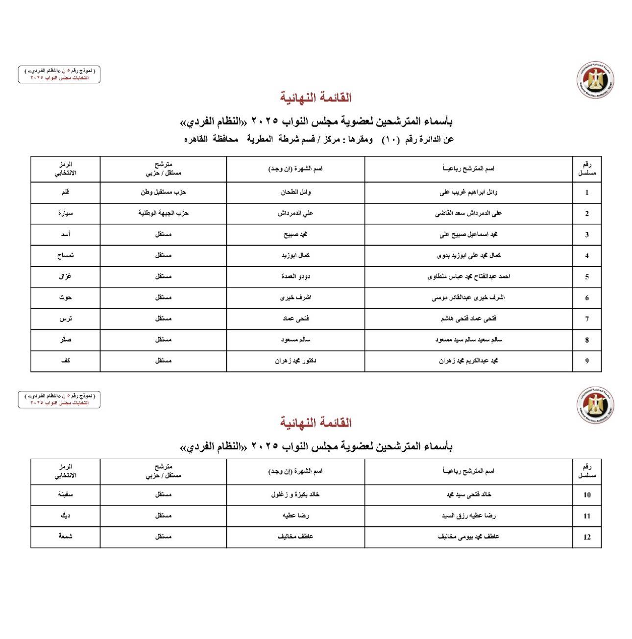 وضمت كشوف المترشحين النهائية الذين سيخوضون انتخابات مجلس النواب علي المقاعد الفردية وهم كالتالي: