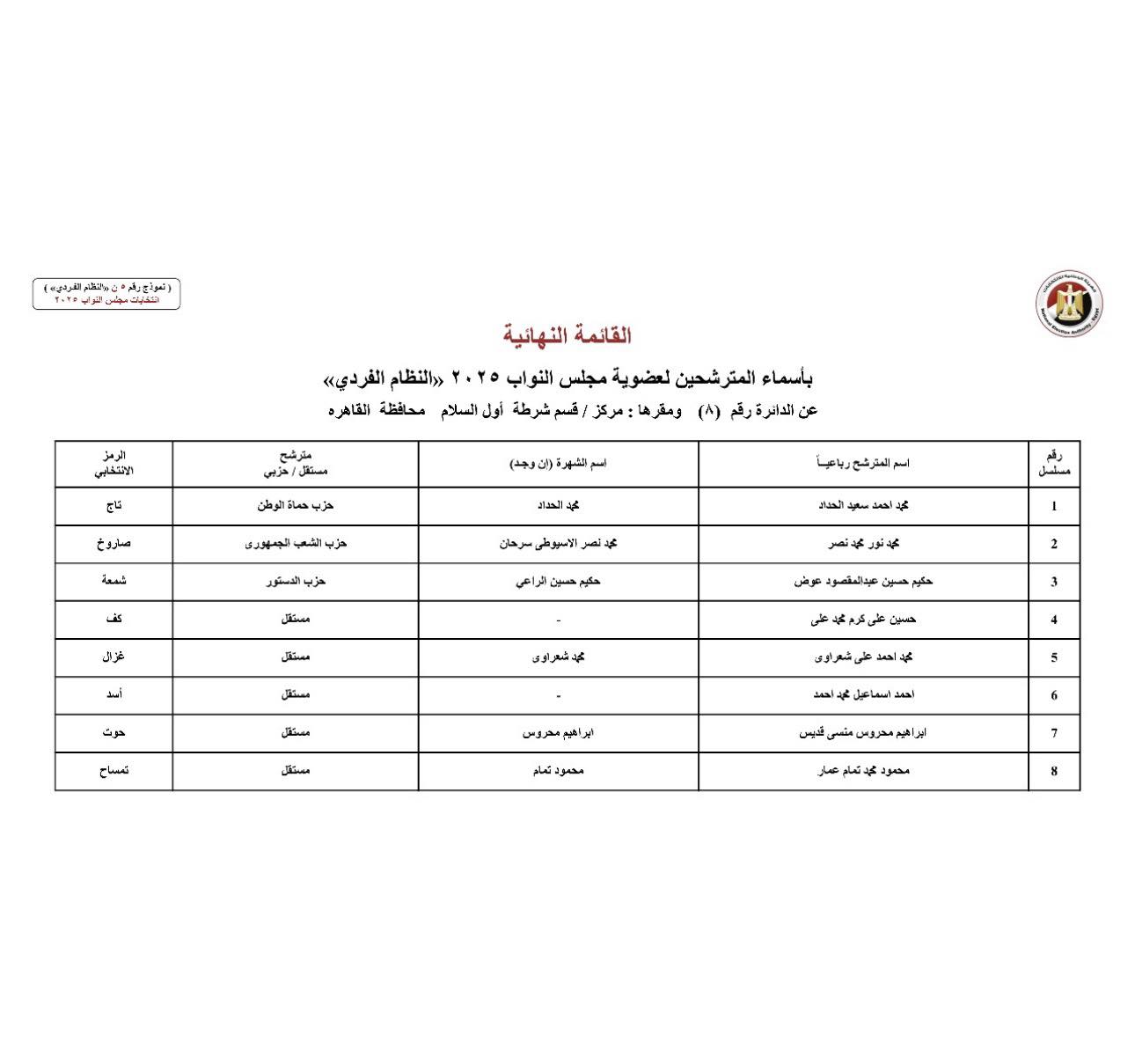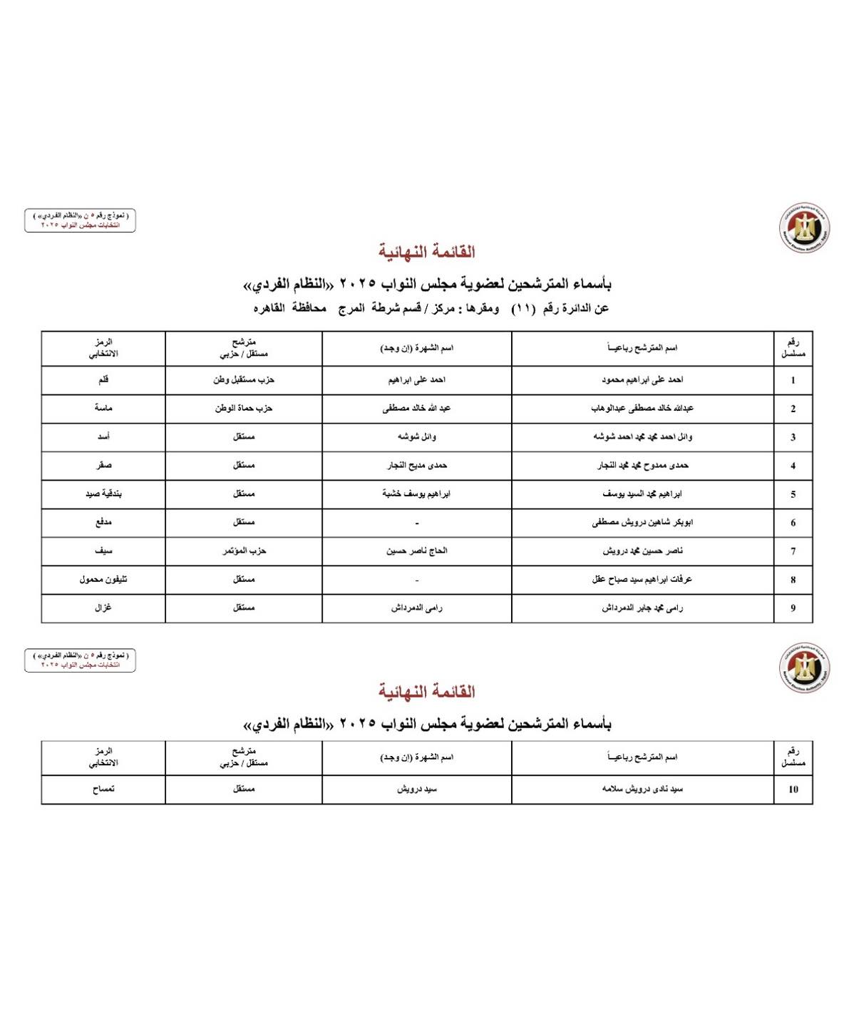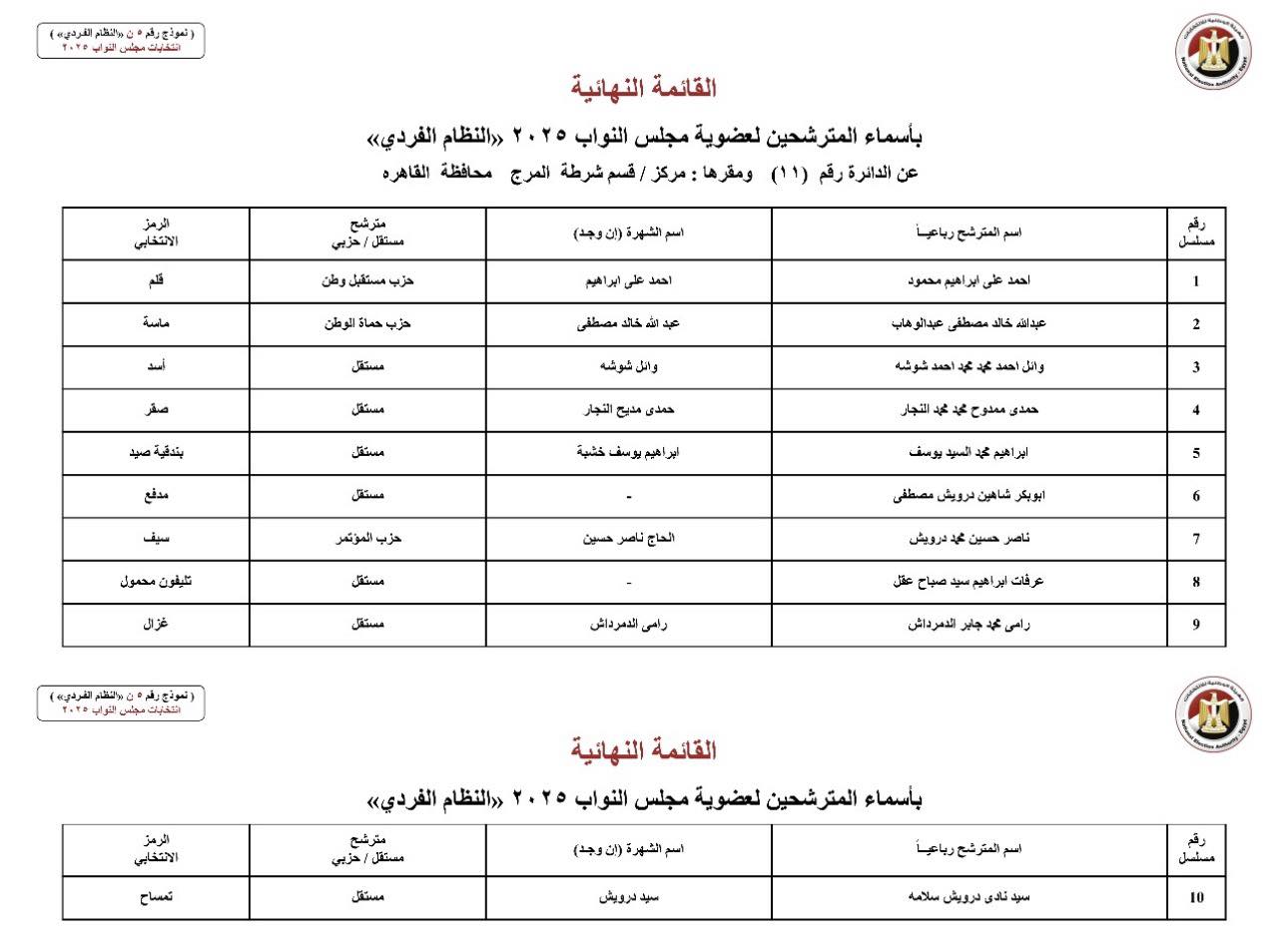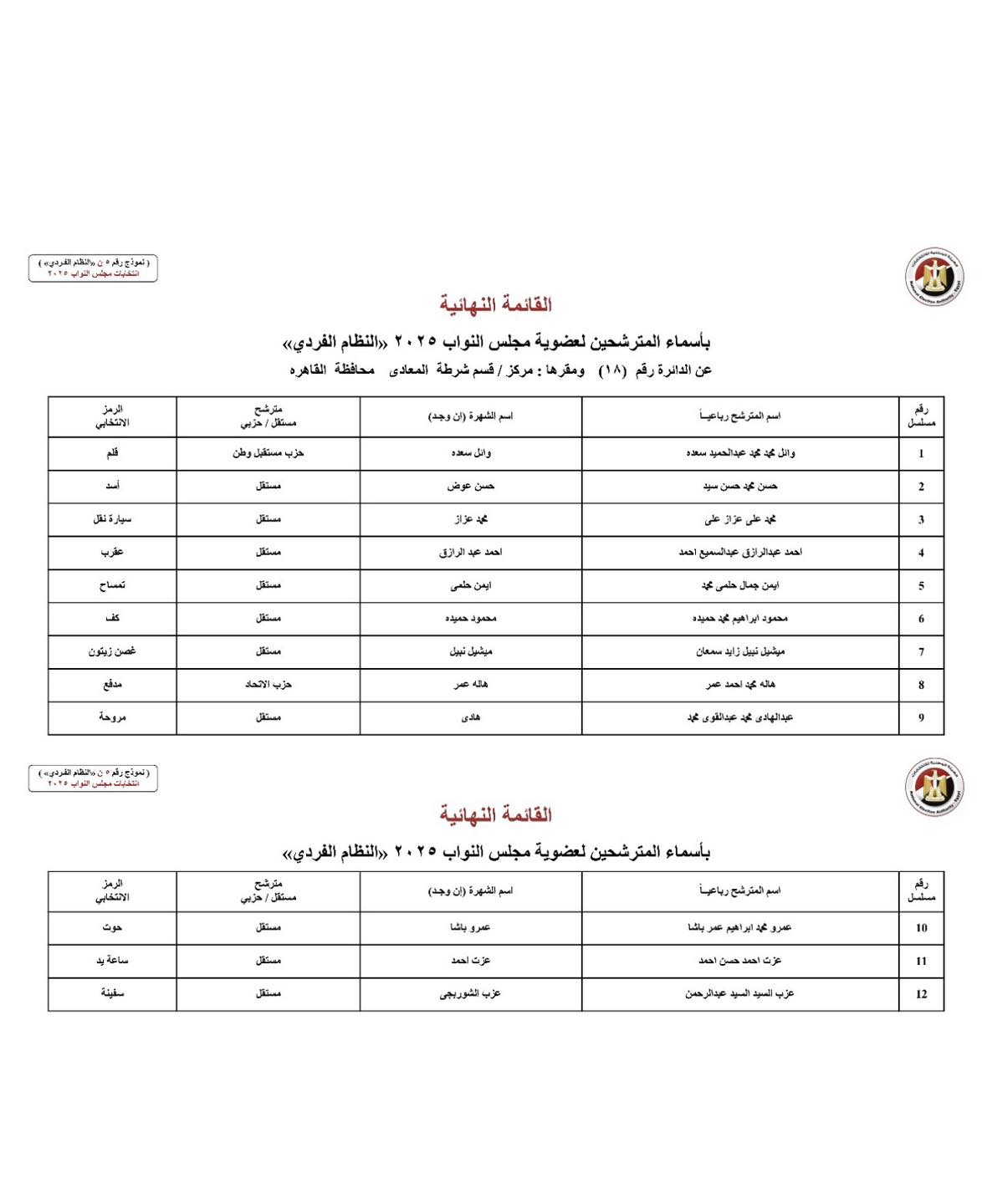 وضمت كشوف المترشحين النهائية الذين سيخوضون انتخابات مجلس النواب علي المقاعد الفردية وهم كالتالي: