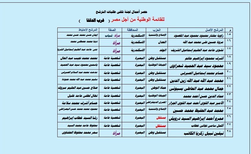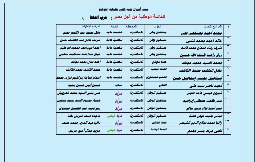 ، بنشر أسماء مرشحي القائمة الوطنية من أجل مصر، في انتخابات مجلس النواب بقطاع غرب الدلتا، والتي تضم محافظات ” الإسكندرية والبحيرة ومرسي مطروح”.
