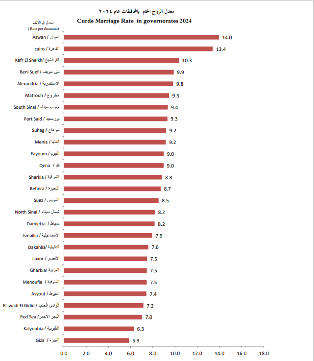 أظهرت بيانات الزواج والطلاق الصادرة عن الجهاز المركزى للتعبئة العامة والإحصاء، أن محافظة أسوان سجلت أعلى معدل للزواج في مصر وبلغ 14 في الألف عام 2024، بينما سجلت محافظة الجيزة أقل معدل زواج في مصر بواقع 5.9 في الألف