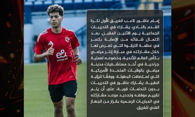 أعلن النادي الأهلي ، اليوم السبت ، مشاركة إمام عاشور، لاعب الفريق الأول لكرة القدم بالنادي، في تدريبات الفريق الجماعية يوم الاثنين المقبل بعد اكتمال شفائه من الإصابة بكسر في عظمة الترقوة التي تعرض لها خلال مشاركته في مباراة إنتر ميامي بكأس العالم للأندية، وخضوعه لعملية جراحية في أحد مستشفيات مدينة ميامي بالولايات المتحدة الأمريكية التي استضافت البطولة.
