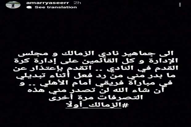 وقدم عمار ياسر، لاعب فريق الشباب في نادي الزمالك، اعتذاره لجماهير النادي ولمجلس الإدارة برئاسة حسن لبيب، عن سلوكه خلال مباراة فريقه أمام الأهلي في دوري الجمهورية، والتي أقيمت أمس على ملعب حلمي زامورا وانتهت بفوز الأهلي ٢-٠.