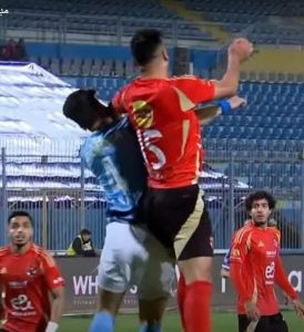 في الدقيقة 34 تصل الكرة من مصطفى فتحي بعد استخلاصها من الدبيس إلى فيستون ماييلي الذي تدخل معه رامي ربيعة بعنف ويحصل رامي على بطاقة صفراء..وسط مطالبات من لاعبي بيراميدز بطرد ربيعة.