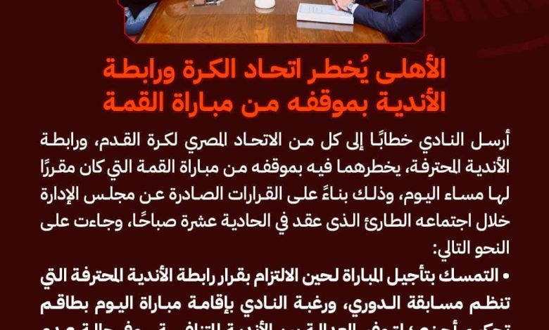 وأضاف :”لم يصلنا رد من اتحاد الكرة، وبادرنا بإرسال خطاب للاتحاد بأن الأهلي متمسك بقرار رابطة الأندية، وطلبه المشروع الذي تدعمه اللائحة، فالأهلي لم يخلق الوقت غير المناسب، لأن القرعة أعلنت في توقيت غير مناسب، لذا الأهلي ليس طرفا في هذه الأزمة”.