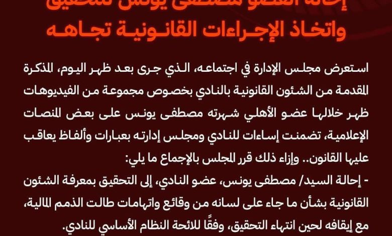 وقال الأهلي في بيان رسمي مساء اليوم الإثنين :”استعرض مجلس إدارة النادي في اجتماعه المذكرة المقدمة من الشئون القانونية بالنادي بخصوص مجموعة من الفيديوهات ظهر خلالها عضو الأهلي، شهرته مصطفى يونس على بعض المنصات الإعلامية، تضمنت إساءات للنادي ومجلس إدارته بعبارات وألفاظ يعاقب عليها القانون”.