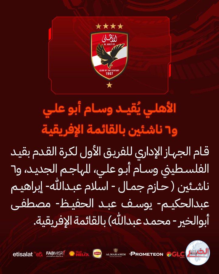 قام الجهاز الإداري للفريق الأول لكرة القدم بالنادي الأهلي بقيد الفلسطيني وسام أبو علي، المهاجم الجديد، و٦ ناشئين ( حازم جمال – اسلام عبدالله- إبراهيم عبدالحكيم- يوسف عبد الحفيظ- مصطفى أبوالخير – محمد عبدالله) بالقائمة الإفريقية.