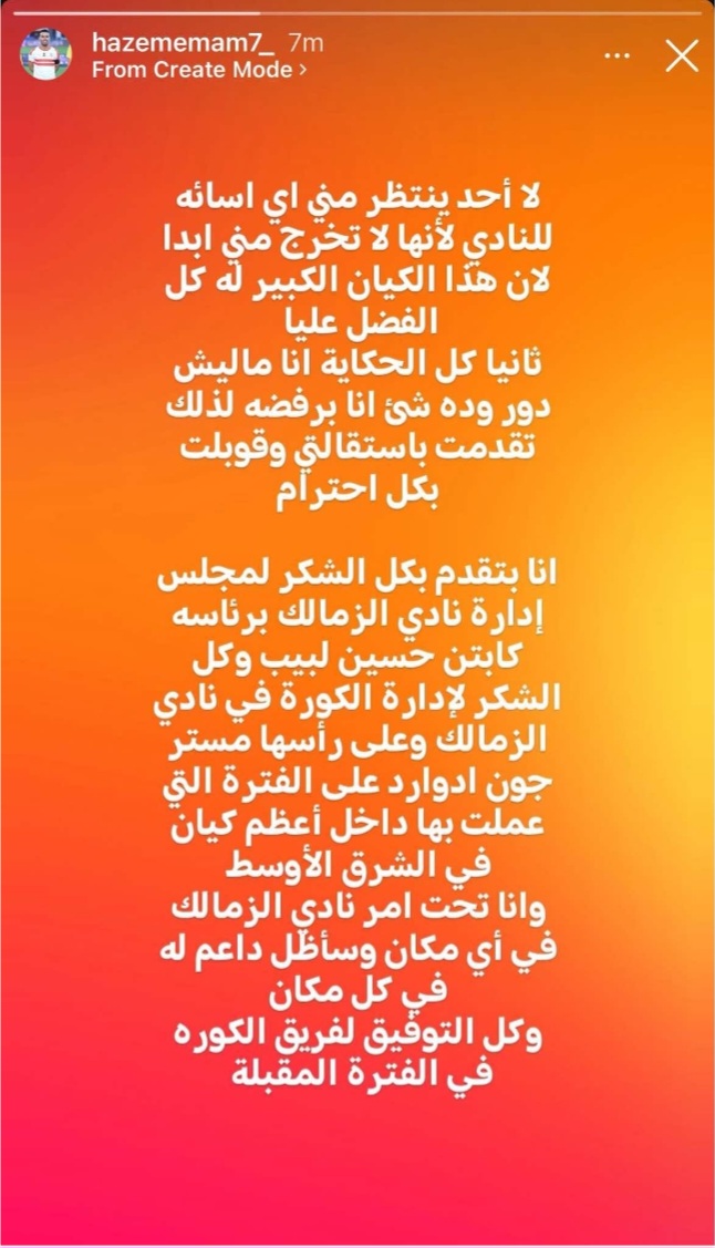 وكتب حازم عبر حسابه على موقع التواصل الاجتماعي ” انستجرام ” :”لا أحد ينتظر مني أي إساءة للنادي لأنها لا تخرج مني أبداً، لأن هذا الكيان الكبير له كل الفضل عليّ.