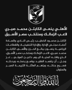 نعى مجلس إدارة النادي الأهلي، برئاسة محمود الخطيب، لاعب الزمالك ومنتخب مصر الأسبق، محمد صبري، الذي توفي صباح اليوم الجمعة إثر حادث سير مؤسف في منطقة التجمع الخامس.