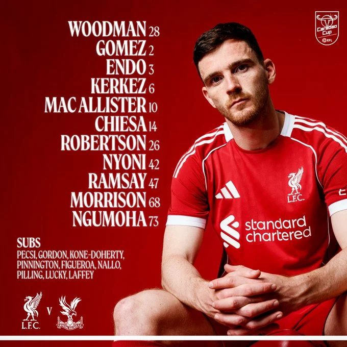 تشكيل ليفربول، أعلن الهولندي آرني سلوت، المدير الفني لفريق ليفربول الإنجليزي، الذي يضم بين صفوفه النجم المصري محمد صلاح، عن التشكيل الأساسي الذي سيخوض به مواجهة كريستال بالاس مساء اليوم الأربعاء، على ملعب أنفيلد، ضمن منافسات الدور الرابع من بطولة كأس الرابطة الإنجليزية.
