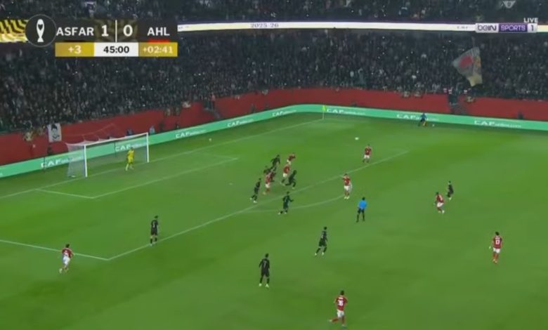 أهدر الأهلي، عدة فرص محققة قبل نهاية الشوط الأول، أبرزها محاولات محمد شريف وتريزيجيه.