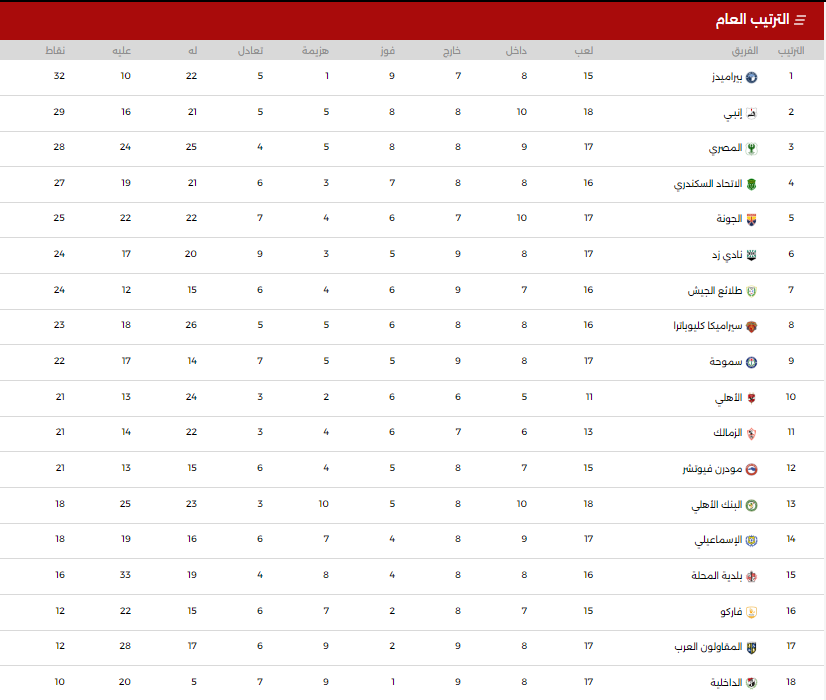 جدول ترتيب الدوري المصري بعد نهاية الجولة الـ 18 لموسم 2023-2024
