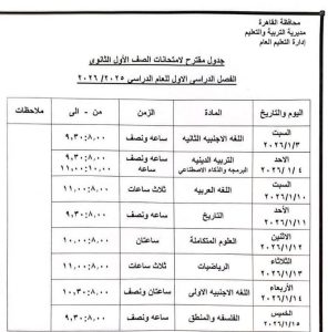 أعتمد الدكتور إبراهيم صابر محافظ القاهرة جدول إمتحانات الفصل الدراسي الأول للعام الدراسى ٢٠٢٥ / ٢٠٢٦ .