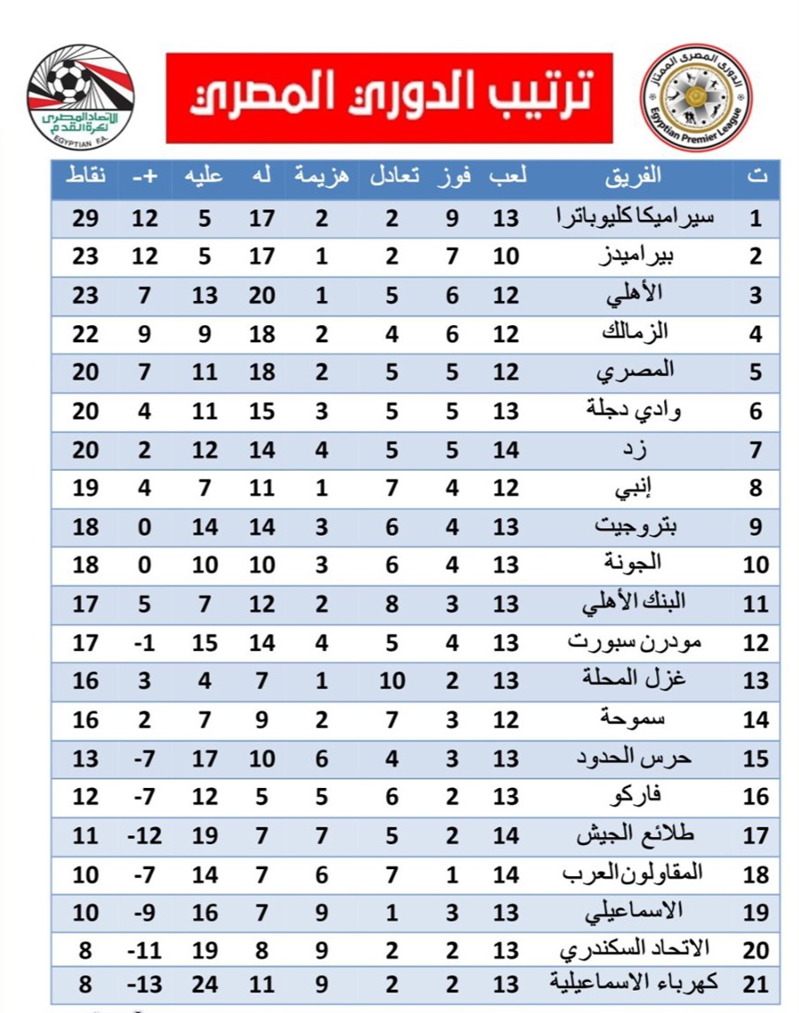 يتصدر سيراميكا كليوباترا قمة جدول ترتيب الدوري المصري برصيد 29 نقطة قبل إقامة مباريات بيراميدز المؤجلة في الدوري.